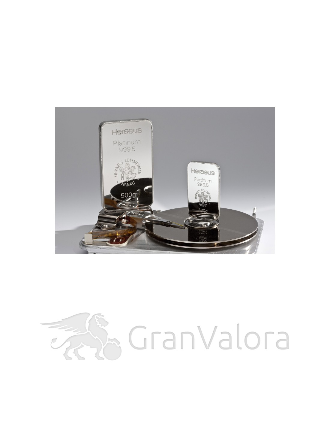 Platin besitzt die drittgrößte Dichte aller Elemente, aus dem grau-silbrigen Metall fertigt man Anlagebarren, die überwiegend geprägt und gestanzt werden. Obwohl sie kein Sicherheitsmerkmal aufweisen, genießen die von Herstellern aus der „Good Delivery List“ produzierten Barren weltweit höchste Akzeptanz, weil sie hohen Qualitätsanforderungen genügen. Zu diesen Produzenten zählt der Hersteller Heraeus, dessen Barren einzeln in einer Folie eingeschweißt geliefert werden. Auf den Platinbarren sind die Angaben zum Hersteller mit Logo - eine Hand, die ausgestreckt drei Rosen hält - sowie zur Metallart, Feinheit und dem Gewicht zu sehen.